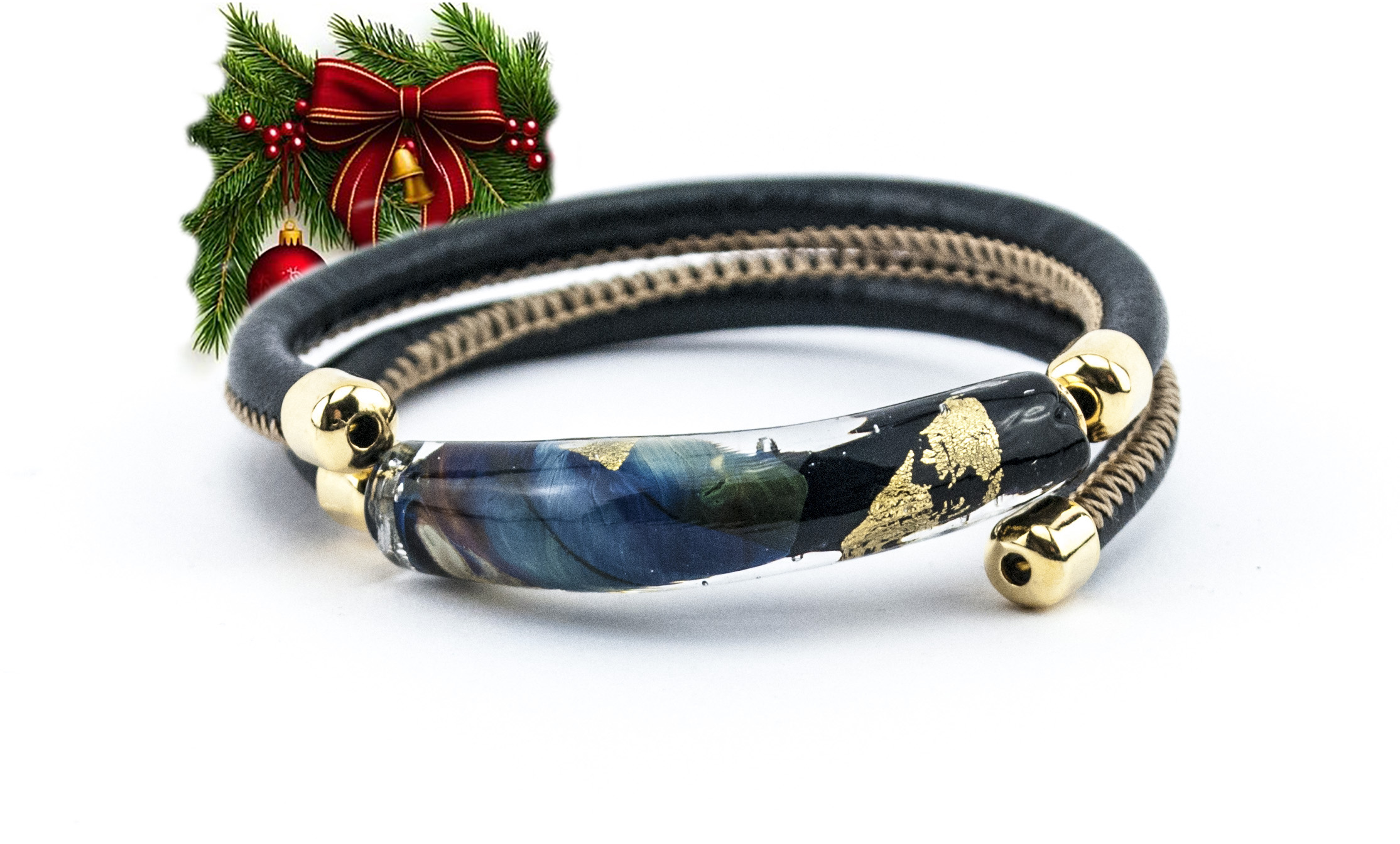 DESCRIPTION: Bracelet with curved tube bead made of chalcedony glass and 24kt gold on a black base. The frame is made of harmonic steel, 55 mm in diameter, covered with stitched leatherette. The metal parts are gold-plated and made of hypoallergenic material. Handmade Murano glass beads and hand-assembled item.
