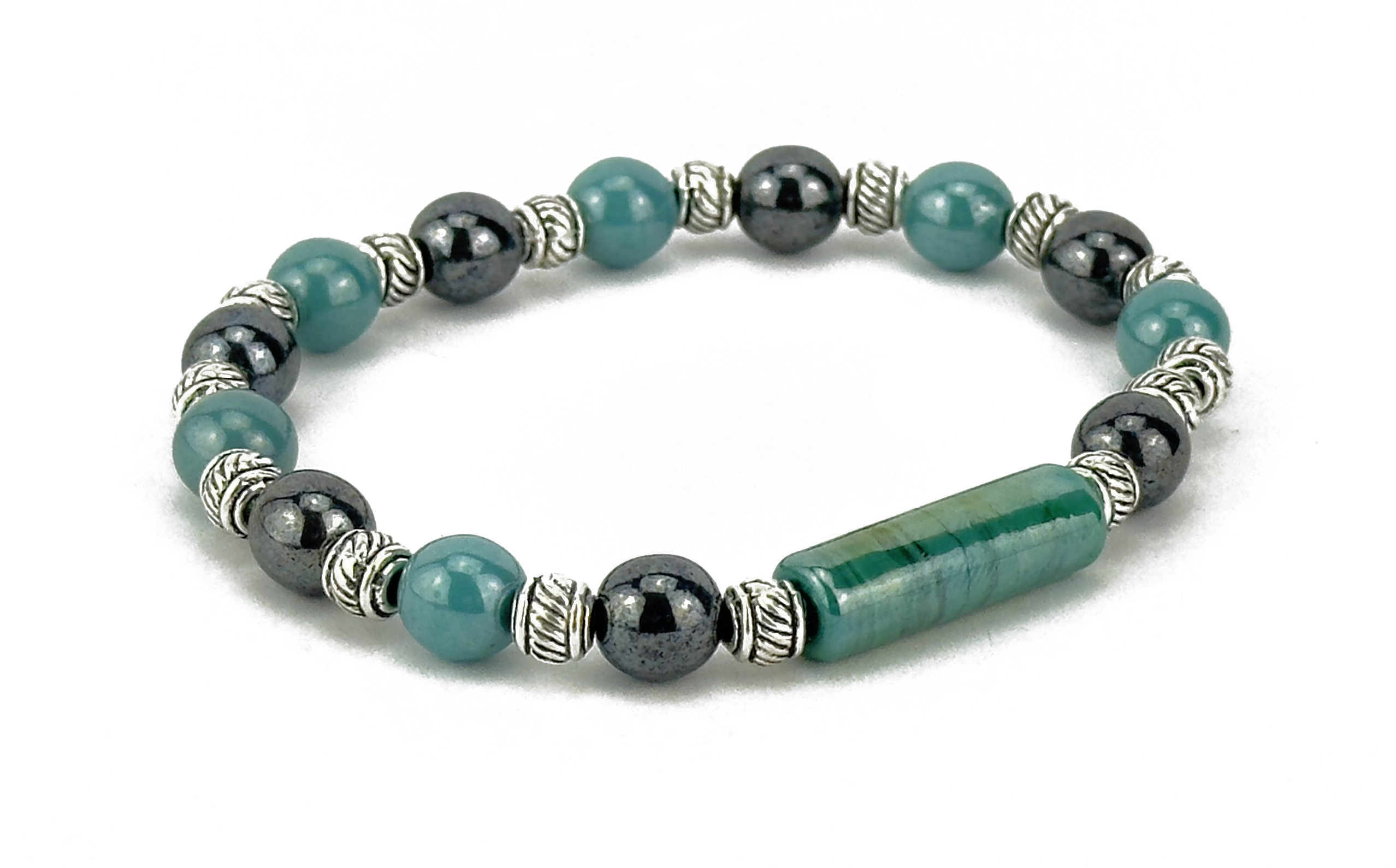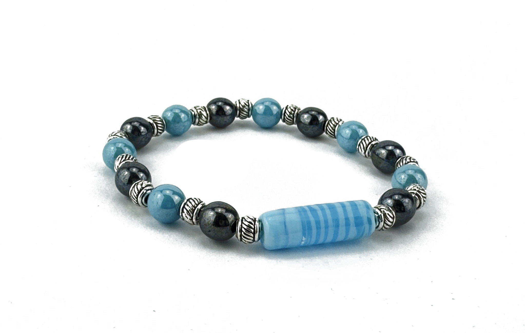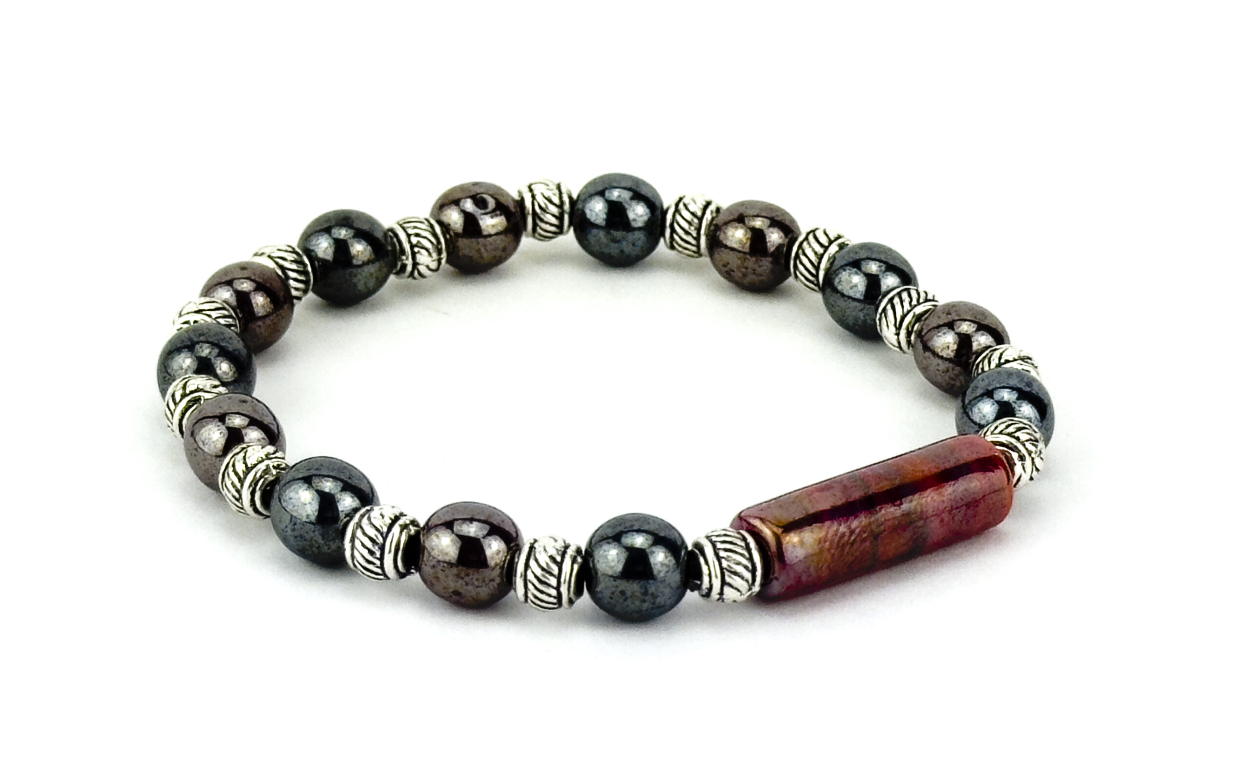 DESCRIPTION: Bracelet with small colored iridescent tube. Beads strung in silicone elastic with high-strength. Colored round beads are iridescent. Metals made of hypoallergenic material. Bracelet and main bead made and assembled by hand in italy.