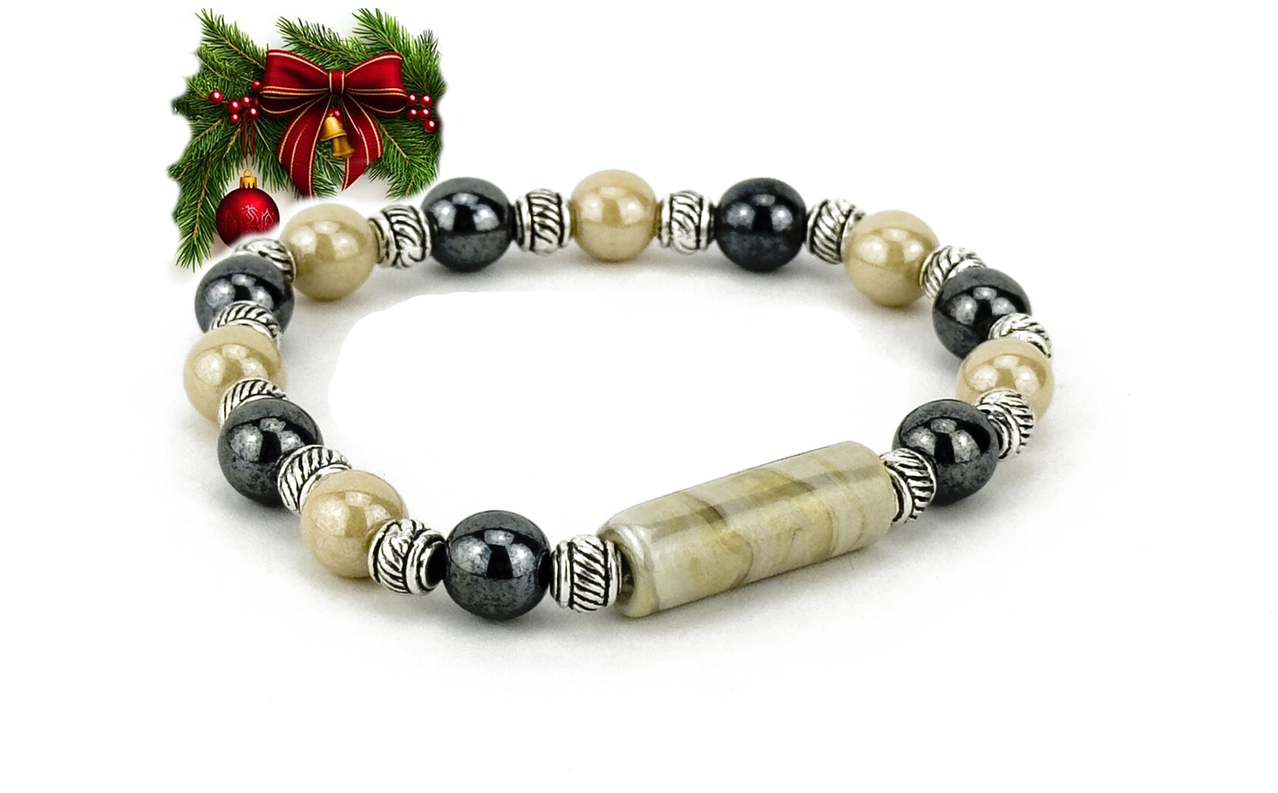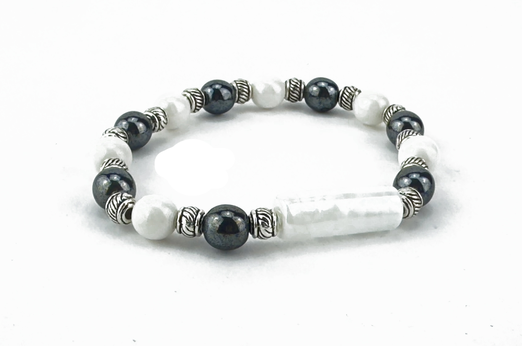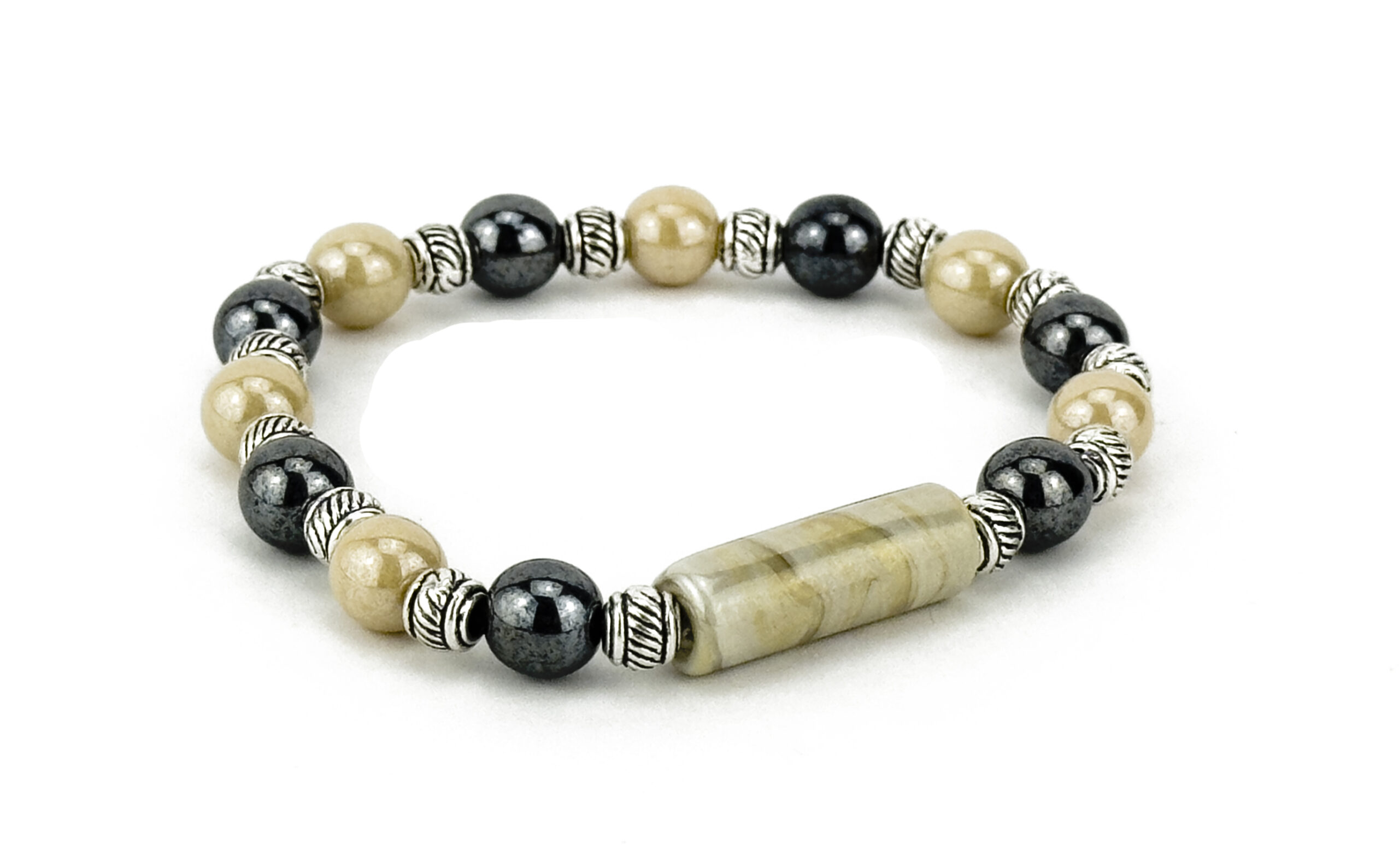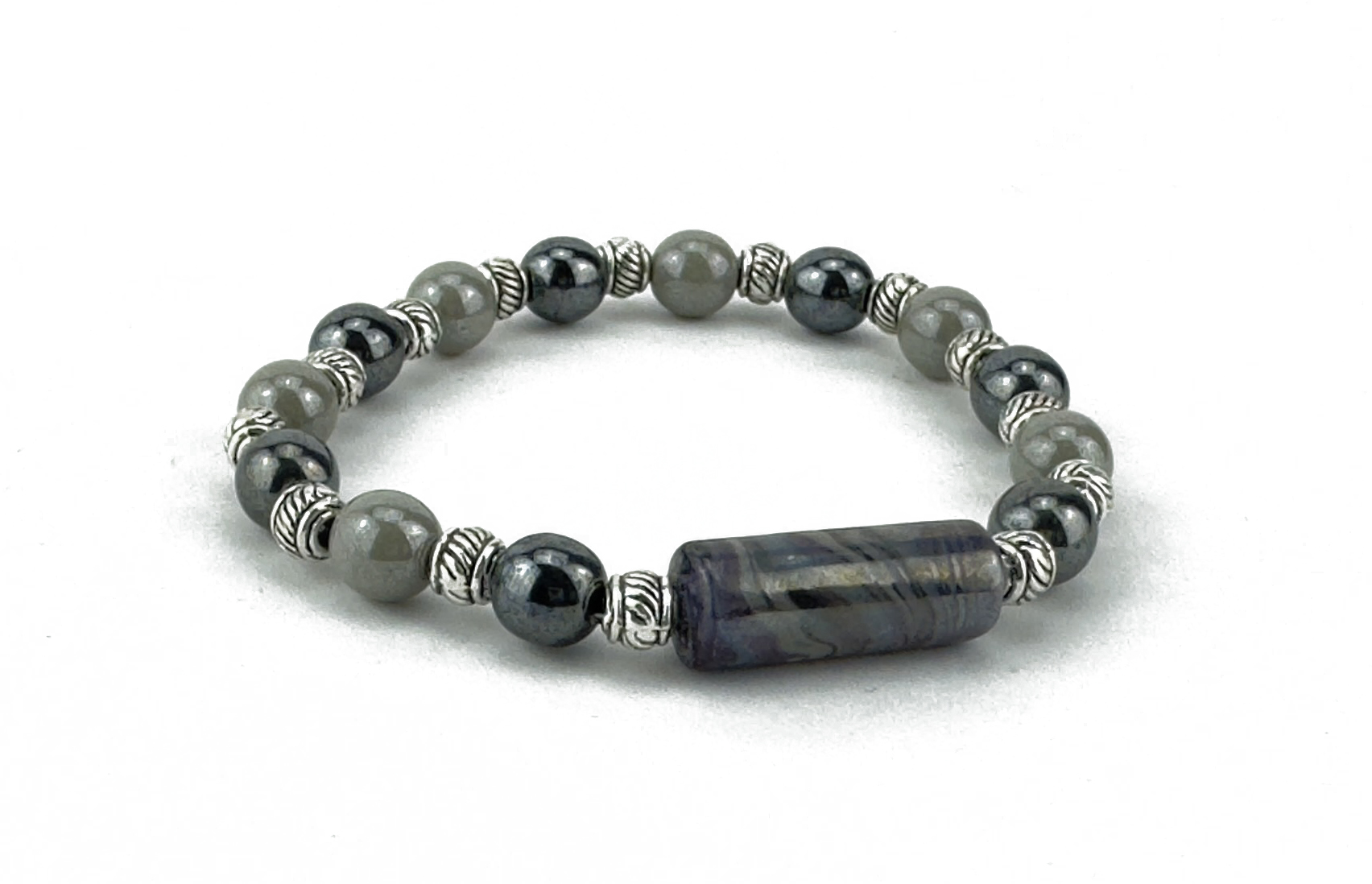 DESCRIPTION: Bracelet with small colored iridescent tube. Beads strung in silicone elastic with high-strength. Colored round beads are iridescent. Metals made of hypoallergenic material. Bracelet and main bead made and assembled by hand in italy.