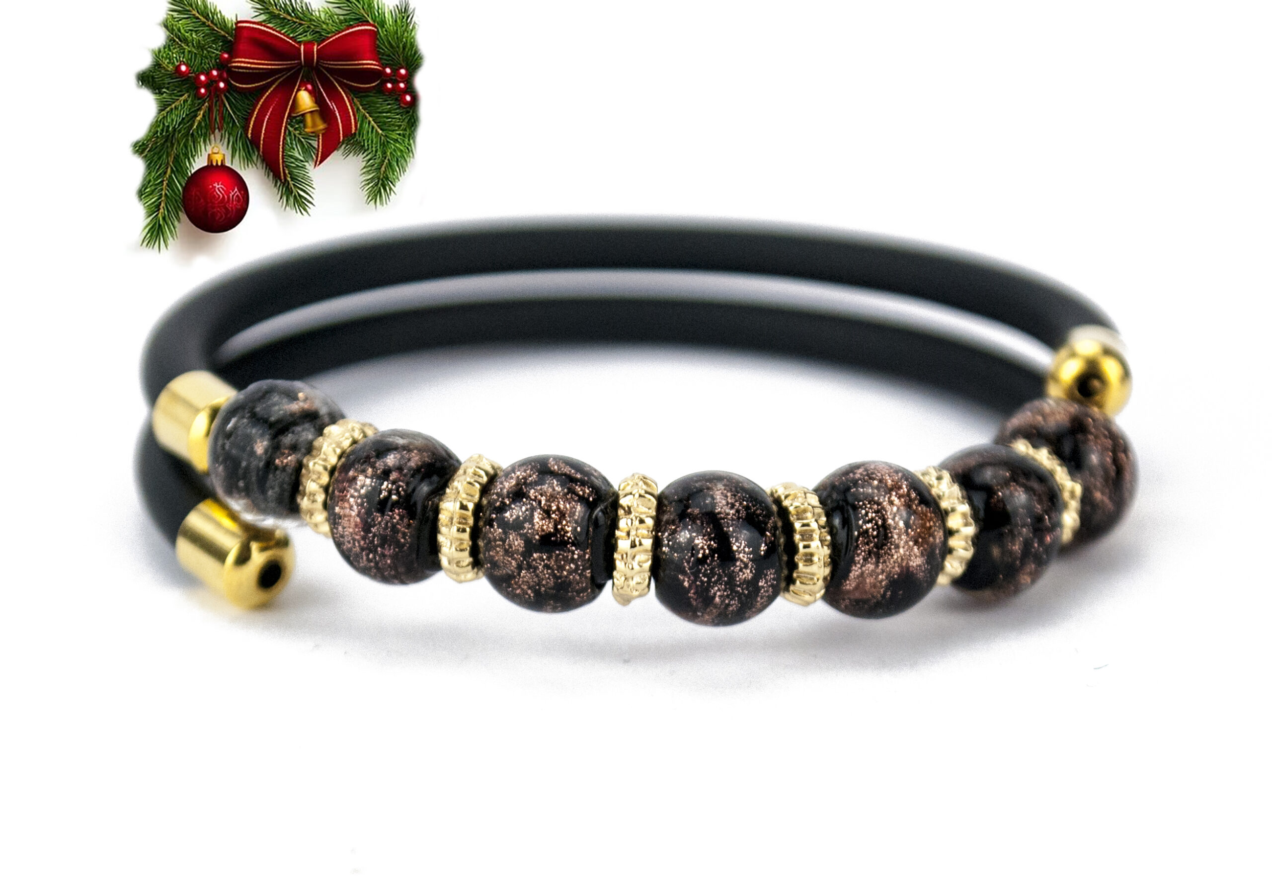 Bracelet with seven 8mm beads in stained glass and aventurine. Style: submerged. 55mm harmonic steel frame covered with pvc. Metal parts are gold plated and are hypoallergenic. Beads and bracelet were handmade